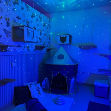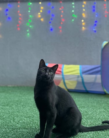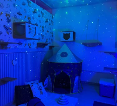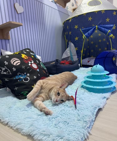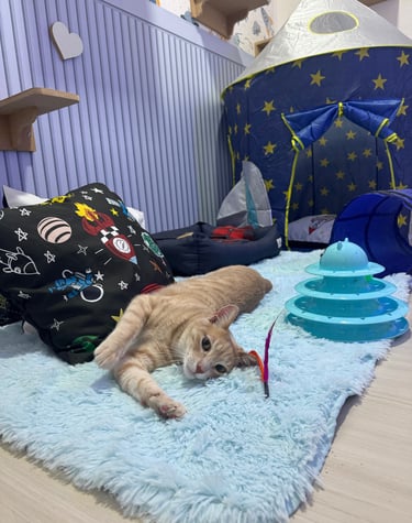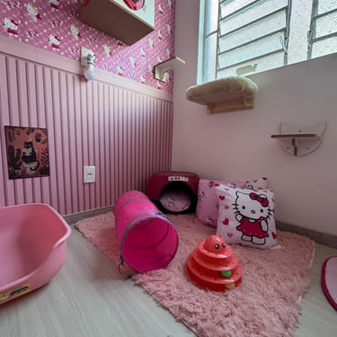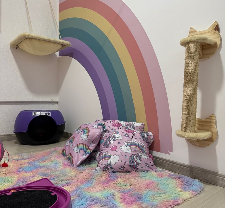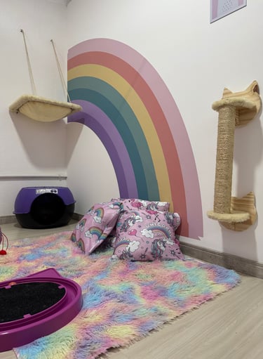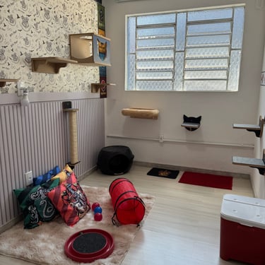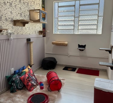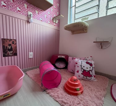 Ambiente enriquecido com: Playgrounds, tocas, túneis, brinquedos e arranhadores. (decoramos o quarto de acordo com a necessidade de cada felino)